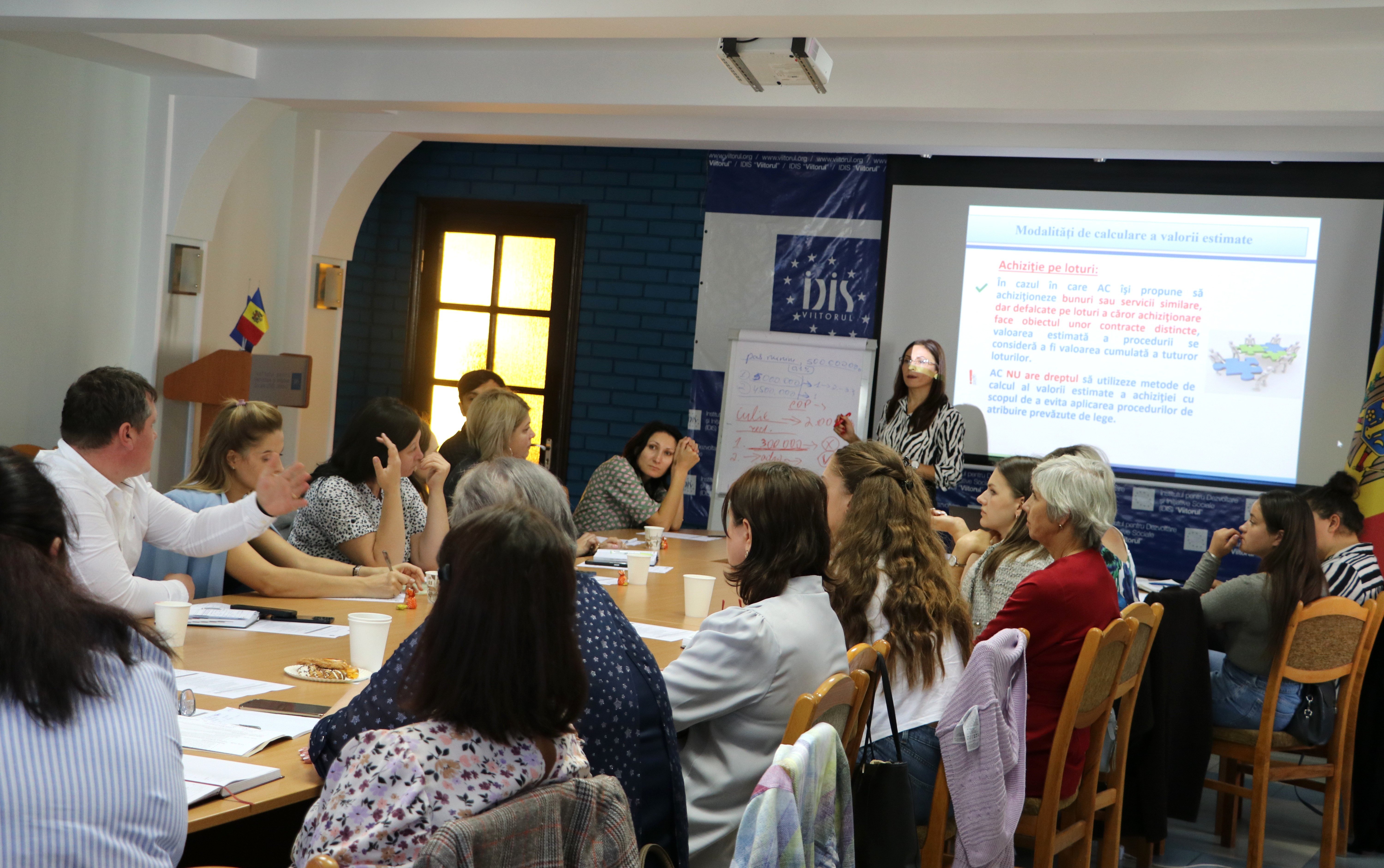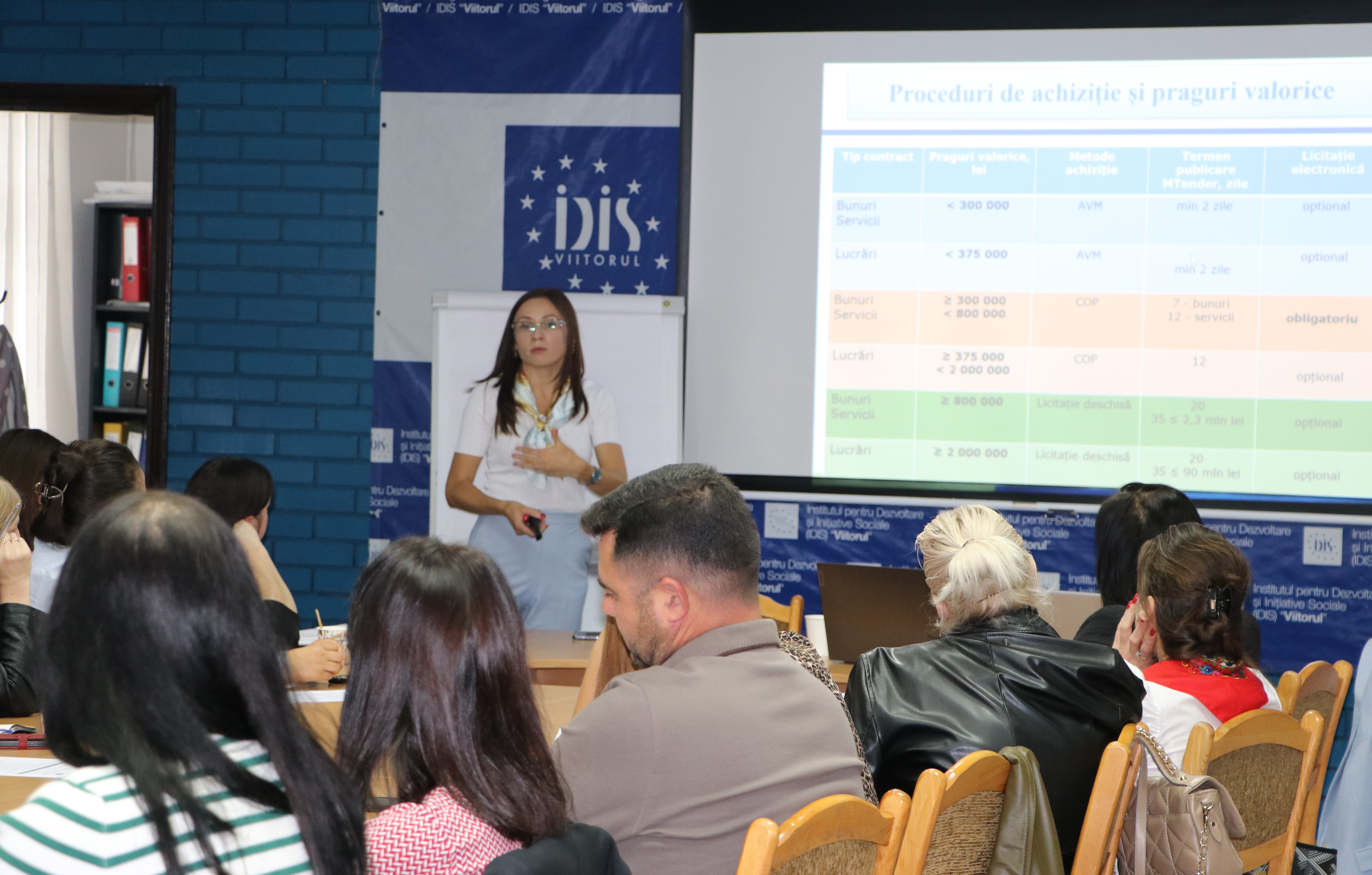 Trainerul Diana Enachi, expertă în achiziții publice la IDIS „Viitorul”, a prezentat în cadrul sesiunilor aspectele legate de cadrul legal al achizițiilor publice, etapele procesului, pragurile și procedurile aplicabile, elaborarea documentației de atribuire, publicarea și desfășurarea achizițiilor în sistemul electronic, procedurile de atribuire a contractelor, mecanismele de contestare și alte elemente relevante.