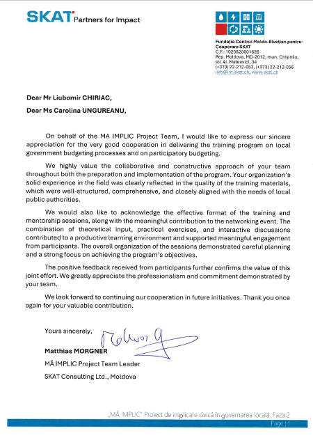 Scrisoare de mulţumire din partea primăriei Cantemir pentru desfăşurarea seminarelor de instruire pentru aleşii locali