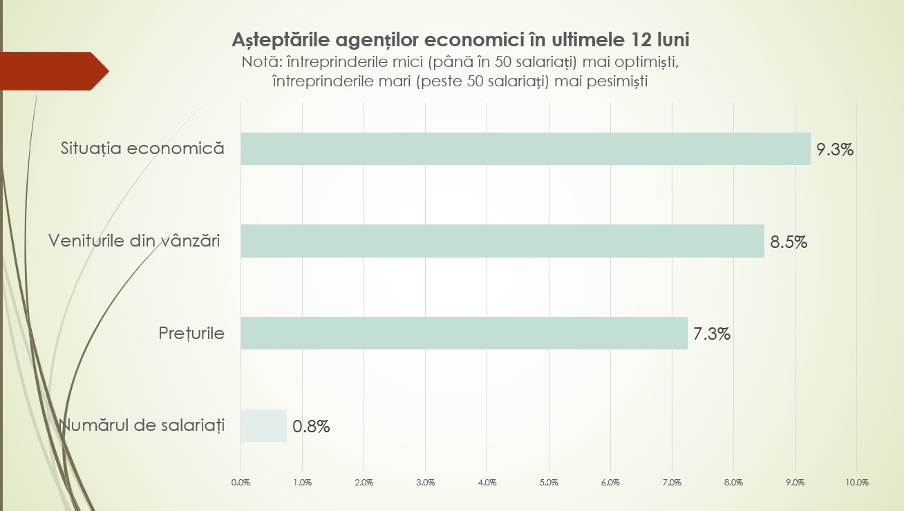În anii precedenți, potrivit economistului, începuturile de an au fost marcate de rezerve mai pronunțate: –6,8% în trimestrul I 2024 și –12% în trimestrul I 2025. În prezent, tendința ultimelor 12 luni indică o redresare – de la –1,3% la +8,5%. Pe ramuri, industria prelucrătoare rămâne cea mai afectată, anticipând o scădere moderată a veniturilor din vânzări (–10%), în special pe fondul dificultăților din industria alimentară. În schimb, celelalte ramuri majore estimează stabilitate.